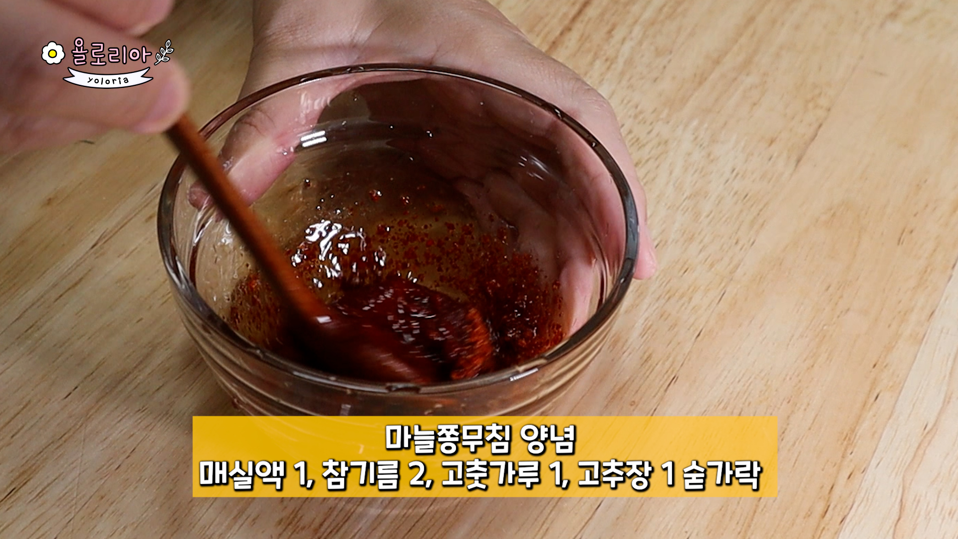 마늘쫑 한 줌, 소금 0.5, 매실액 1, 참기름 2