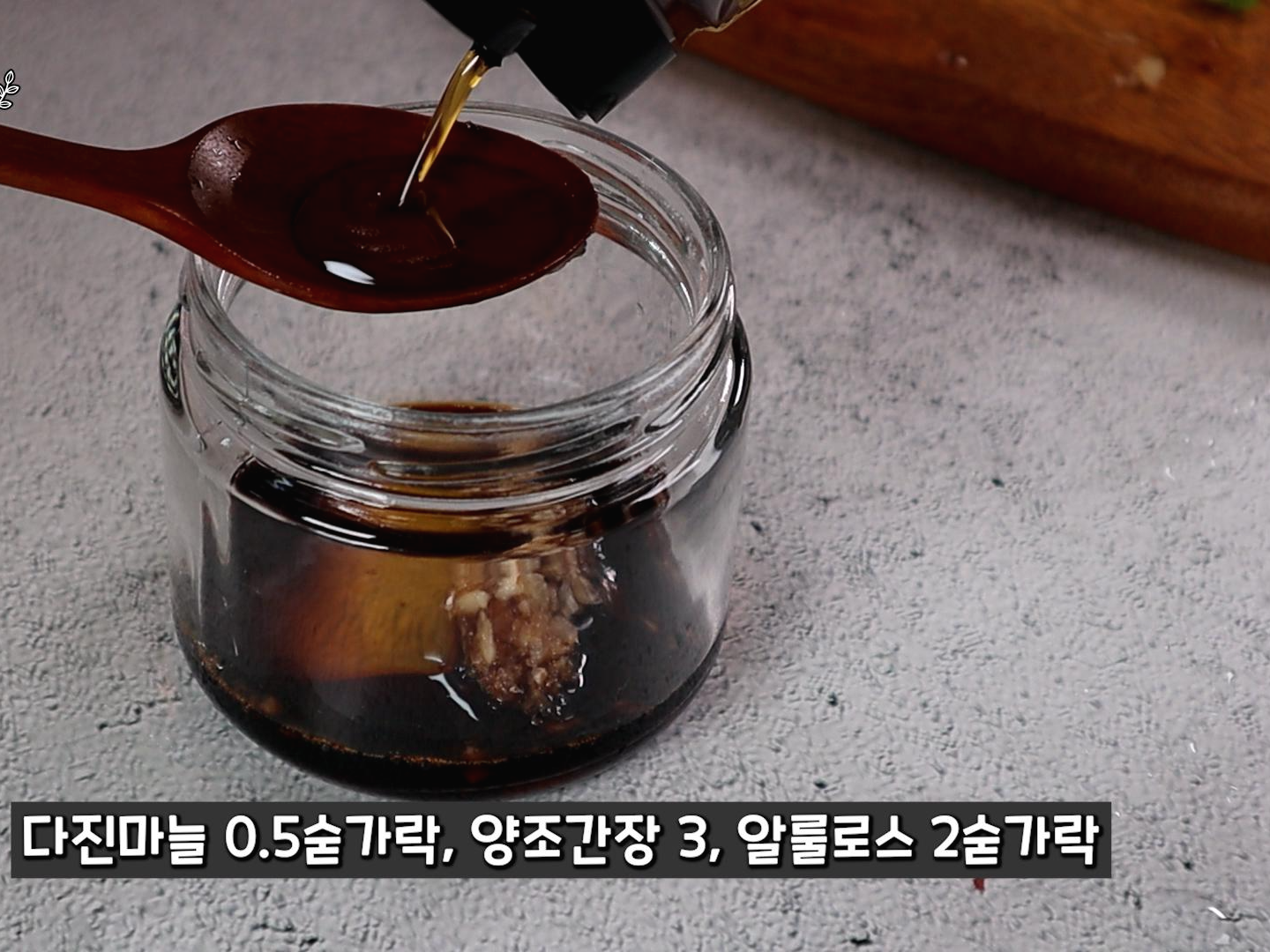 2.다진마늘 0.5, 양조간장, 알룰로스 2숟가락, 깨 0.5숟가락 넣고
