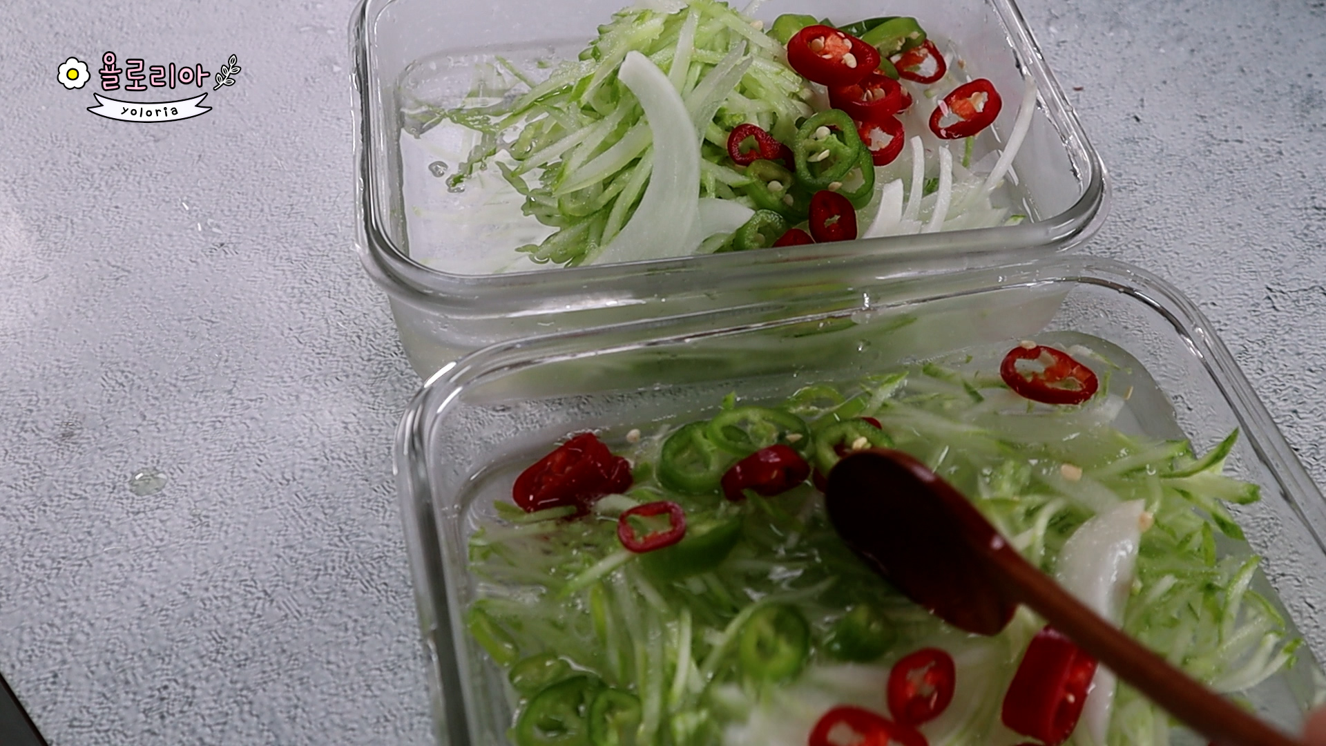 썰어 놓은 오이와 양파, 고추를 넣고