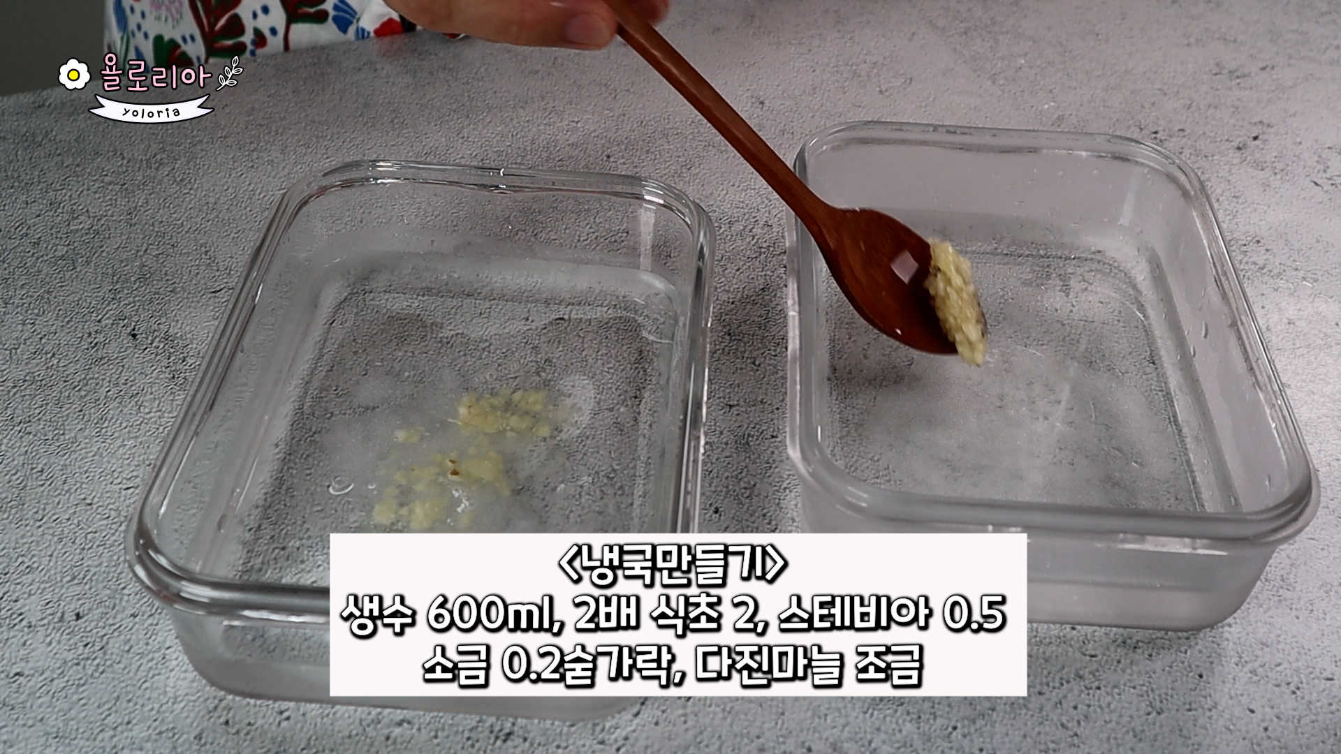 생수, 다진마늘, 소금, 2배식초, 스테비아 또는 설탕